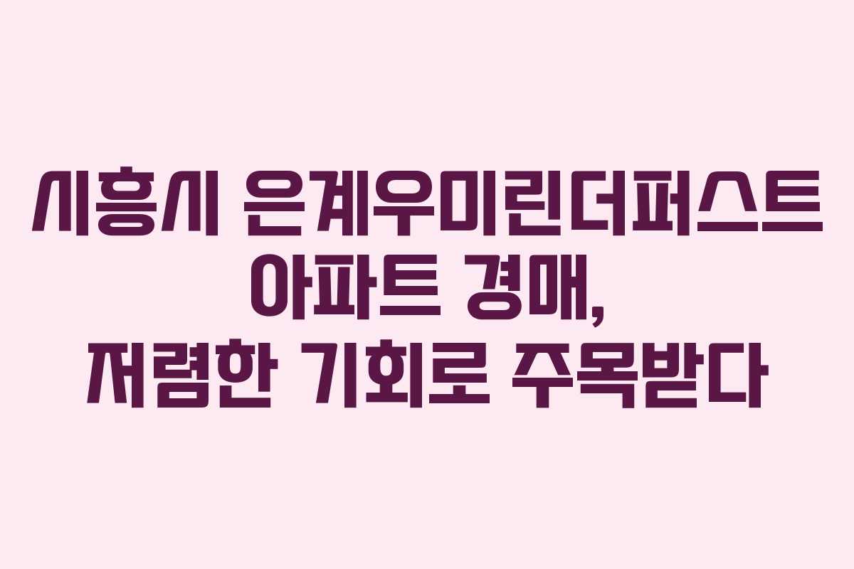 시흥시 은계우미린더퍼스트 아파트는 최근 경매에 나와 많은 이들의 관심을 끌고 있다. 이 아파트는 매각 기일이 다가오면서 투자자와 구매자들에게 저렴하게 아파트를 구매할 수 있는 기회를 제공하고 있다. 본 문서에서는 해당 아파트의 경매 정보, 주변 환경, 그리고 입찰 준비 과정에 대해 자세히 알아보겠다.