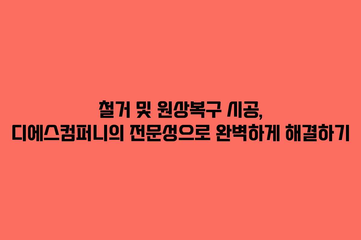 철거 및 원상복구 시공은 단순한 작업이 아닌, 고객의 새로운 시작을 위한 중요한 과정이다. 디에스컴퍼니는 이러한 과정을 통해 고객에게 최상의 결과를 제공하기 위해 노력하고 있다. 고객의 신뢰를 얻기 위해 항상 철저하게 준비하고, 성실함을 바탕으로 최상의 서비스를 제공할 것을 약속한다.