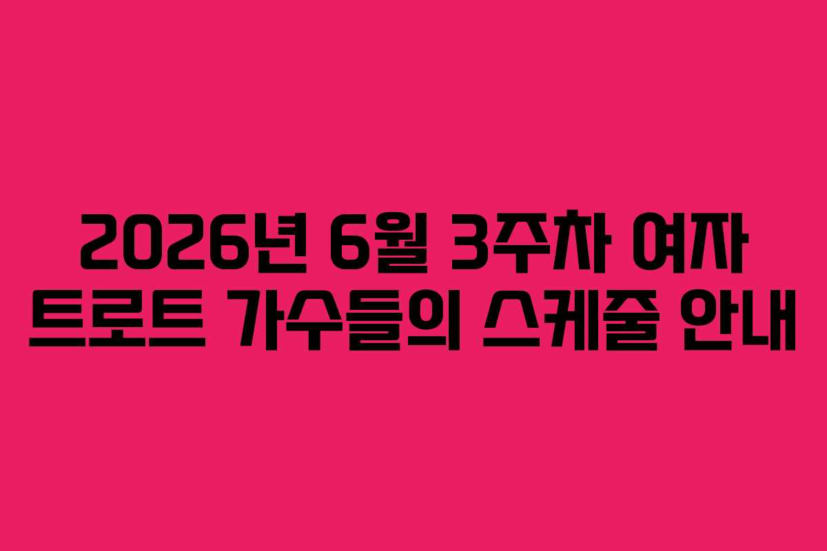 2026년 6월 셋째 주, 여자 트로트 가수들의 다양한 활동 일정이 예정되어 있습니다. 라디오 방송, 공연, TV 출연 등 여러 가지 이벤트가 진행될 예정이니, 팬 여러분들께서는 일정에 맞춰 관람하시기 바랍니다.