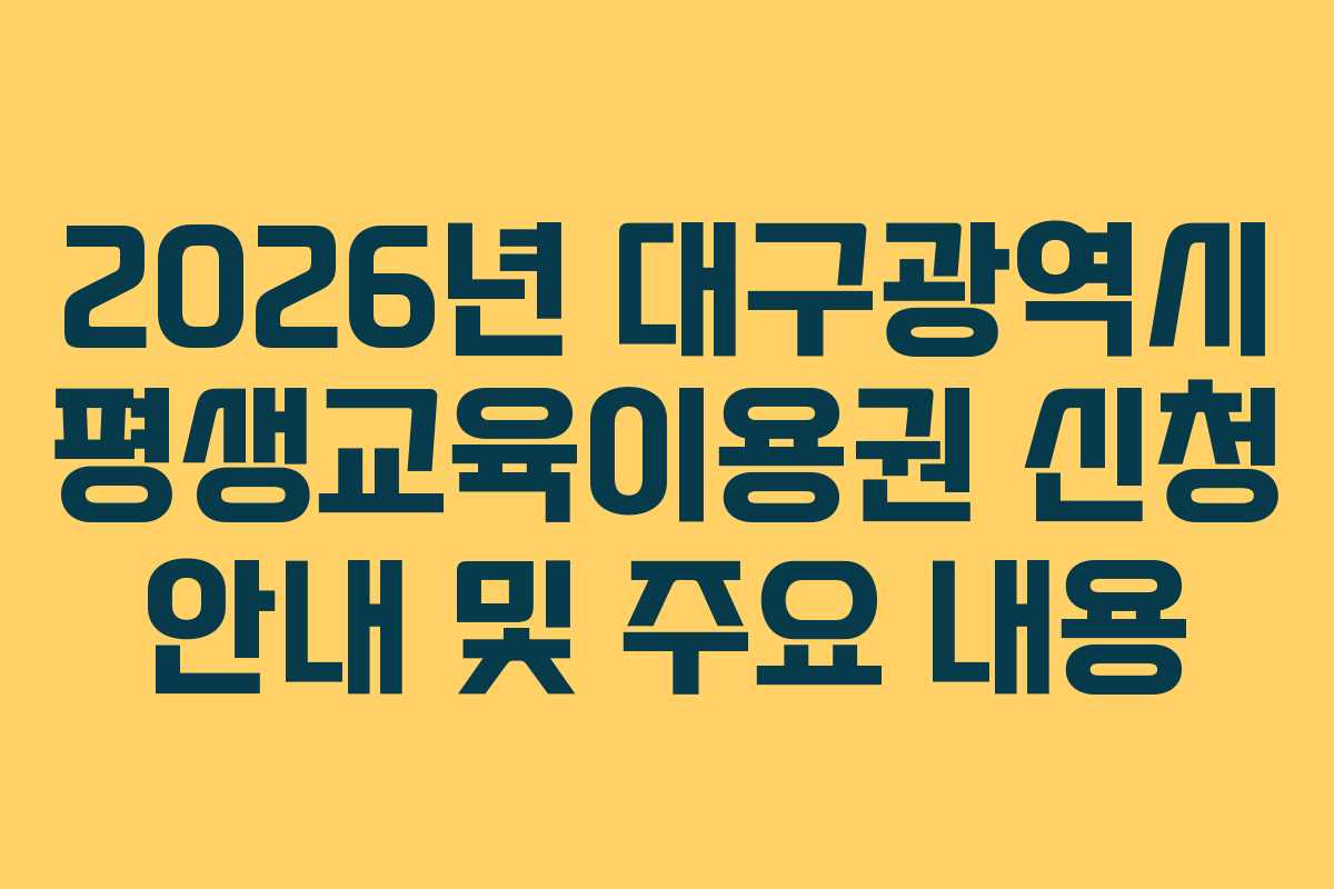 2026년 대구광역시에서 시행하는 평생교육이용권 신청의 중요 내용과 신청 방법을 소개합니다. 경제적 여건에 따른 교육의 격차를 해소하고, 저소득층 성인의 자기계발 및 자아 실현을 도모하기 위한 이 프로그램에 많은 관심과 참여를 바랍니다.
