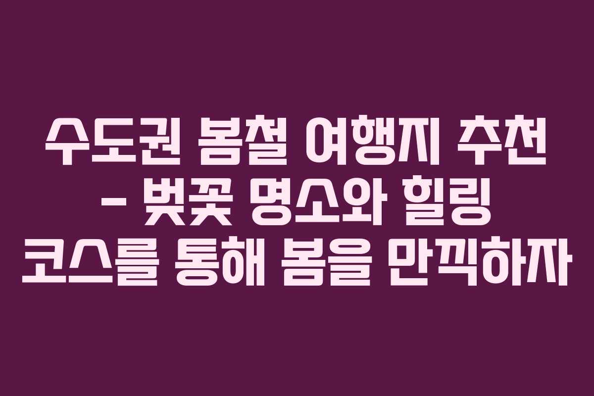 2026년 봄철, 수도권은 벚꽃과 함께 따뜻한 날씨가 어우러져 야외 활동에 적합한 장소입니다. 다양한 명소와 드라이브 코스, 힐링 공간이 마련되어 있어 소중한 추억을 쌓을 수 있는 기회를 제공합니다. 이번 봄에는 소개한 여행지에서 즐거운 시간을 보내며 특별한 기억을 만들어보시기 바랍니다.
