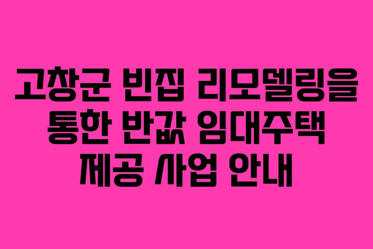 고창군에서는 농촌 지역의 빈집을 활용하여 저소득층을 위한 주거 복지를 실현하는 ‘빈집활용 반값 임대주택 제공사업’을 추진하고 있다. 해당 사업은 방치된 빈집을 정비하여 주거 환경을 개선하고, 새로운 주거 기회를 제공함으로써 농촌 활성화를 목표로 하고 있다.