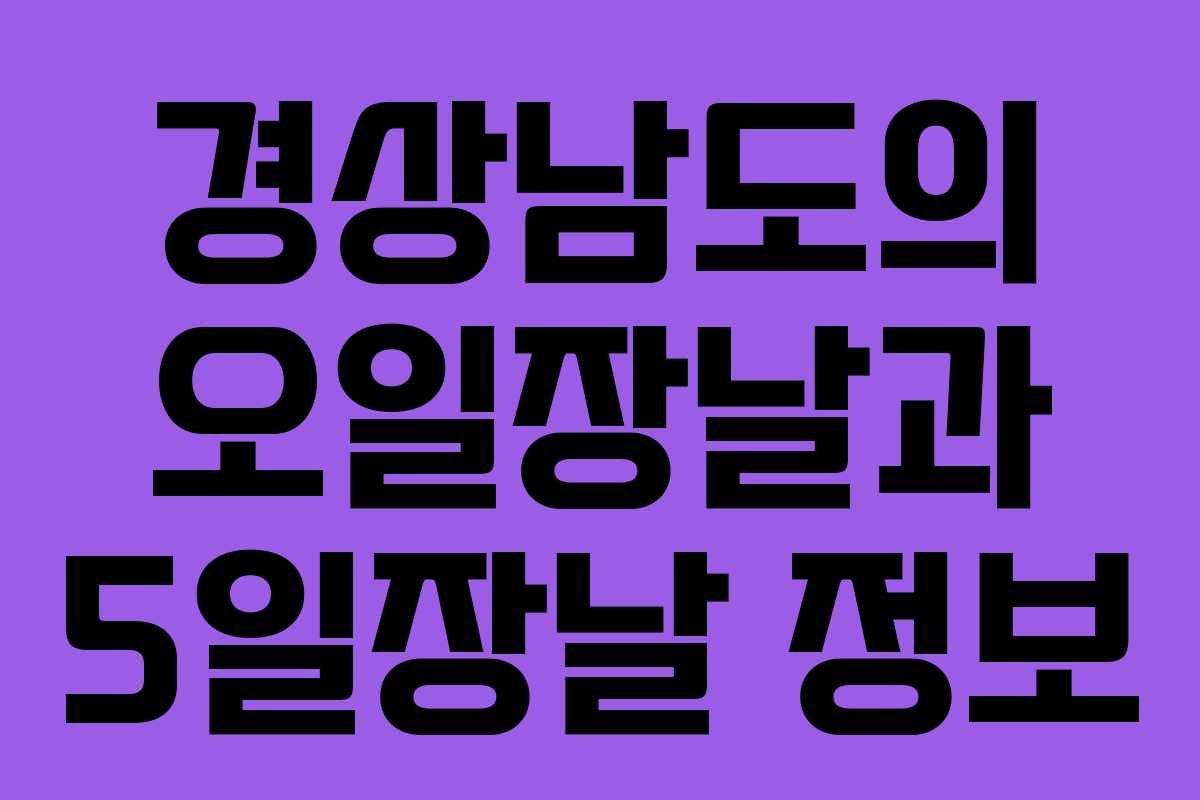 경상남도의 오일장날과 5일장날은 각 지역에서 정해진 주기로 열리며, 이 시장들은 지역주민과 방문객 모두에게 중요한 역할을 하고 있습니다. 특히, 2026년 기준으로 경상남도의 여러 지역에서 열리는 5일장은 지역의 특산물과 문화를 직접 접할 수 있는 기회를 제공합니다. 예를 들어, 거제시의 거제장은 매월 4일과 9일에 열리고, 창원시의 경화장은 매월 3일과 8일에 개최됩니다. 이러한 정기적인 장날은 지역 주민들에게는 생활의 일부로 자리잡고 있으며, 외부 방문객들에게는 색다른 경험을 제공합니다.