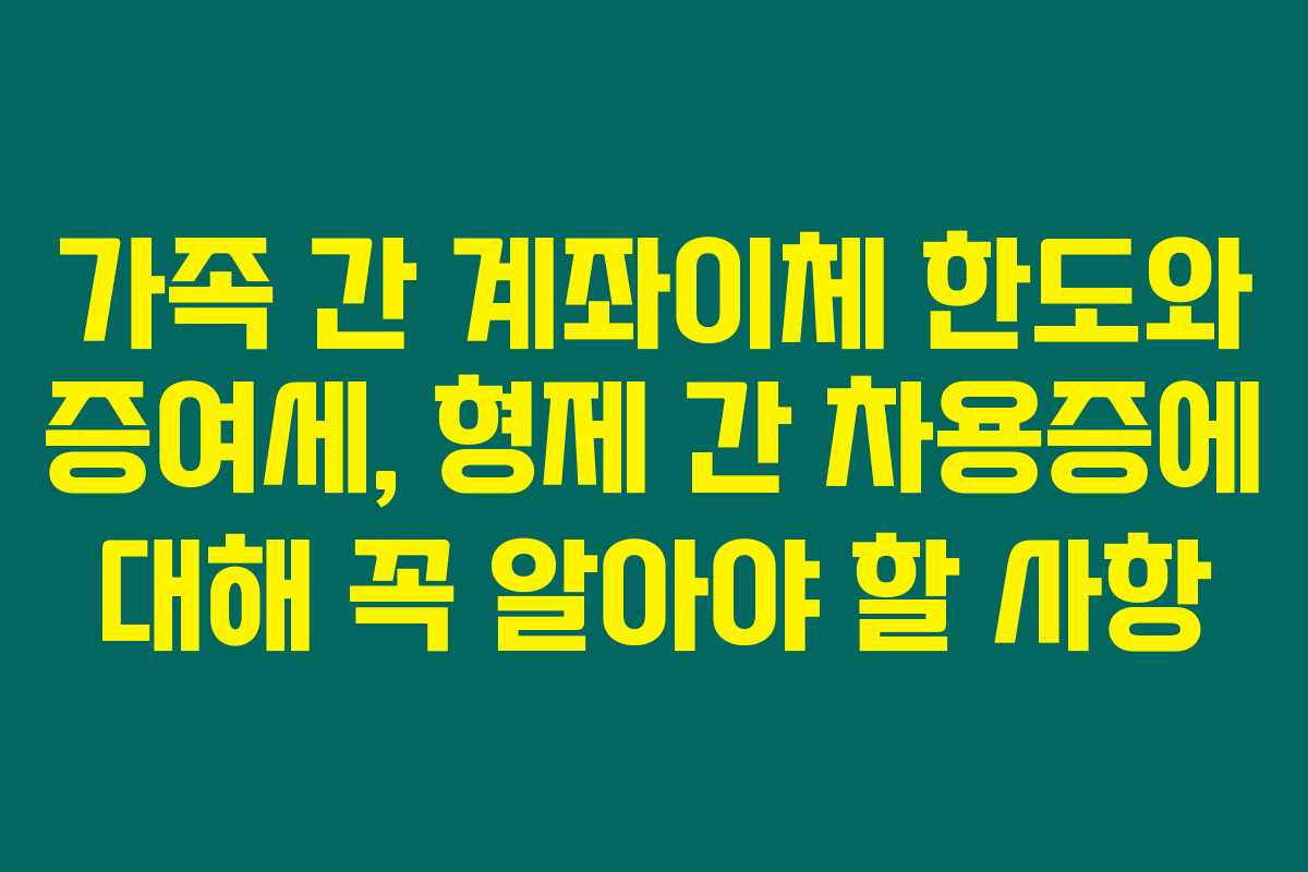 가족 간 계좌이체 한도로 인해 혜택을 보려는 사람들을 위해, 만약 여러분이 가족 간에 계좌이체를 자주 한다면 증여세가 문제될 수 있어요. 이런 점이 궁금하신 분들은 아래를 읽어보시면 큰 도움이 될 거예요. 정보를 제대로 안 챙기면 세금폭탄 맞을 수 있으니까 주의해야 해요.