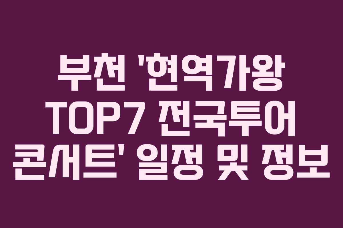 부천에서 열리는 ‘현역가왕 TOP7 전국투어 콘서트’의 세부 정보와 예매 방법을 안내드립니다. 이 콘서트는 대한민국의 트로트 가수들이 참여하는 서바이벌 오디션 프로그램의 일환으로, 많은 기대를 모으고 있습니다.