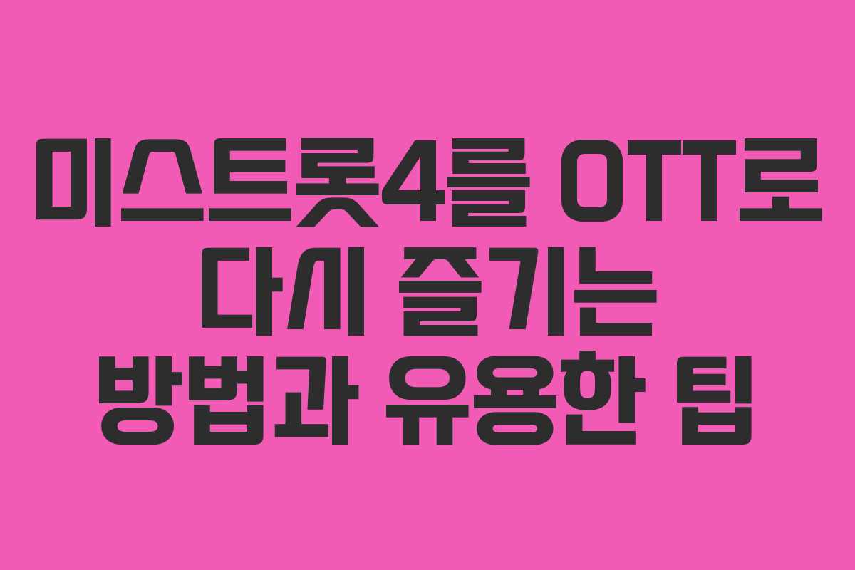 미스트롯4의 열기가 다시금 전국을 뜨겁게 달구고 있다. 이번 시즌은 더욱 강력한 무대와 참가자들로 돌아왔으며, 많은 시청자들이 기대하고 있다. 그러나 본방송 시간에 맞춰 TV 앞에 앉아 있기는 쉽지 않다. 따라서 이번 글에서는 미스트롯4를 OTT 플랫폼에서 재방송과 다시보기로 즐기는 방법과 유용한 팁을 소개하겠다.